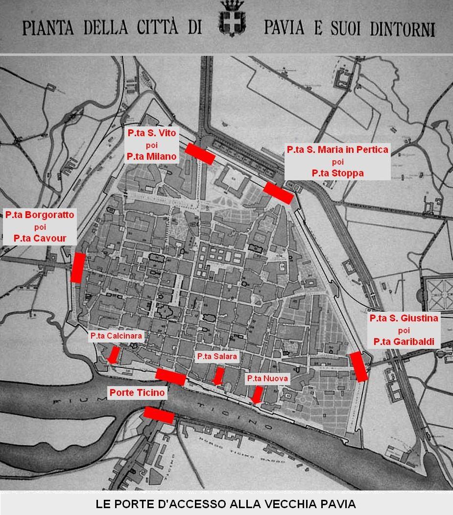 Avevamo la porta a occidente, Porta Borgoratto, sulla direttrice di Torre d'Isola, quella a Est verso Cremona, due a Nord rispettivamente verso Milano e verso il il contado della strada Vigentina e verso Sud, all'imbocco settentrionale del ponte coperto, e sullo stesso una porta sul lato meridionale.