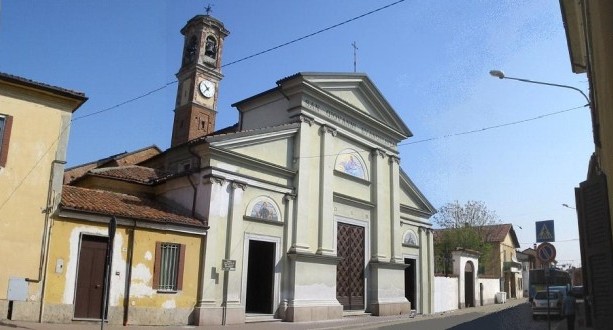 Nel 1877 fu consacrata dal vescovo di Vigevano. La chiesa si trova sulla via principale inframezzo ad altre costruzioni. Nel 1922 fu in parte ancora soggetta a restauri e nel 1936 fu abbellita con decorazioni e affreschi dal pittore locale A. De Paoli.